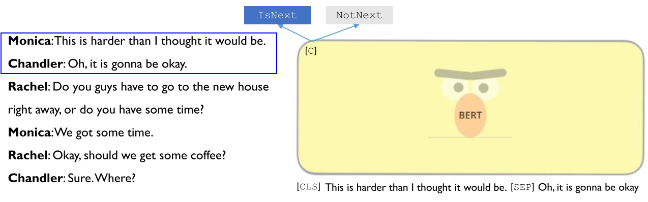 전체 코퍼스에서 두 개의 문장을 추출하는데 50%는 실제 앞뒤 문장을 사용하고, 나머지 50%는 랜덤으로 두 문장을 사용한다. 그리고 가장 마지막에 출력되는 C 토큰을 이용하여 이 문장들이 Nest sentence인지 아닌지 판별하는 classification 을 수행한다. 이 과정은 MLM과 함께 진행된다. 논문에 따르면 이 방식은 간단하지만 모델 성능을 향상에 기여한다.